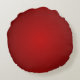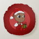 A round pillow with an illustration of a cute smiling African American baby holding a Christmas present and wearing a Santa Claus hat; in a red circle on a red background, a Christmas holidays design