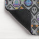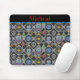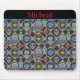 This Cute Alien mouse pad has a cute Nordic alien sweater pattern based off of the theme of classic Fair Isle knitted designs. The pattern is of grey and black circles and diamond stripes. Each shape has different cute retro alien motifs in it. You have cute retro robot, UFO abduction, a space ship with green alien, a grey alien head, solar system, an alien plant, retro ray gun and a star fighter. In-between the pattern are moons, and stars. At the top is a bar in matching colors with a name. Personalize this with your own name.