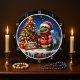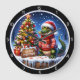 This whimsical round graphic is a festive Christmas design. It features a cute cartoon alligator wearing a Santa hat and a red sweater, sitting next to a decorated Christmas tree. A sign on the snow-covered ground reads 'MERRY CHRISTMAS,' creating a charming and unique holiday scene.