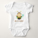 Bee is for Baby! The caption is a cute and amusing play on the alphabet B that sounds like Bee. Parents of a newborn baby boy will love to dress their boy in this adorable and comfortable baby one piece suit which has a picture of a baby boy dressed in a bumble bee outfit of yellow and black stripes, feelers hair band and wings. The boy is holding on to a blue flower and waving happily at you. Great as a baby shower gift.
