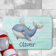 This personalized bath mat features a cute whimsical whale in a vibrant pink and blue color scheme swimming playfully with a tiny hat.