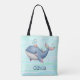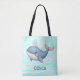 This personalized tote bag features a cute whimsical whale in a vibrant pink and blue color scheme swimming playfully with a tiny hat.