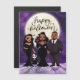 This cute cartoon illustration features a gorgeous African American curvy woman in a Morticia costume, and her husband in a Gomez Addams costume with their little girl dressed as Wednesday, a young adult daughter in a spooky gothic dress. Perfect for celebrating Halloween with the whole family, this design captures the fun and spooky spirit of the season. Ideal for personalized Halloween greeting cards.