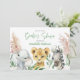 Cute animal botanical floral safari script baby shower invitation. White flowers botanical foliage and elephant, lion and zebra. Script text, part of a collection available in different color ways.