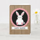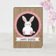 This card features a stylized white bunny with long ears and tiny dot eyes, giving it a sweet, friendly look 🐰. Soft pink touches color the inner ears and little paw pads, adding a gentle, affectionate feel like a quiet hug between friends. The bunny sits inside a solid black circle that makes the white figure stand out sharply. Around that circle is a scalloped ring in bright pink, like a decorative seal that frames the character with a flirty, cheerful edge 🌷. The background looks like light brown wooden planks with visible grain, bringing a cozy, rustic setting to the modern illustration. Below the main emblem, a white banner stretches across the lower area with a celebratory message set in black text. The banner text is centered and easy to read, standing out clearly against the white strip. The pink scalloped border forms even rounded bumps all the way around the black circle.