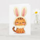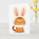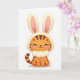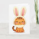 Designed with a centered, stylized animal character on a plain white background, this illustration keeps the focus on a small wild-feline-like figure dressed in a bunny outfit 🐰. The character has a round tangerine-orange head, a softly rounded body with dark brown stripes, and a striped tail that curls to one side like it’s leaning in for a gentle cuddle. A cream-colored hood with long, oversized ears frames the face, with pale pink ear interiors that echo the rosy cheek marks and add a tender, friendly touch. Around the face and collar sits a fluffy ruffled trim, giving the costume a cozy, cloud-soft look. The expression is bashful and affectionate, with eyes closed in happy arcs, a tiny heart-shaped nose, and a small curved smile that feels like a quiet crush or close friendship. There is no visible border, and the lighting stays bright and even with no shadows, while a short line of text in soft pastel pink sits near the top, leaving open space around the character 🌷. The long cream ears rise above the head with rounded tips, and the pink inner panels are clearly visible.