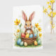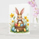 This card shows a sweet, human-like bunny with light brown fur and a white chest, its long ears framing dark, gentle eyes and a tiny smile that feels like a friendly hello 🐰. A soft blush on its cheeks and the slightly tilted head suggest a tender, affectionate mood, as if it’s posing for someone it trusts. The bunny sits snugly inside a rustic woven basket, leaning against a cheerful pile of decorated eggs that look carefully arranged like a small gift. The eggs show mixed patterns in blue speckles, red accents, sunny yellow tones, and small floral details that add a romantic, springtime charm 🌷. Around the basket, fresh green grass is dotted with upright yellow blossoms and a few taller flowers that frame the scene like a natural border. The background stays mostly white with faint, misty circles of pale green that keep the focus on the bunny and basket. Near the top, a short Easter greeting appears in a soft pastel color, centered and easy to spot. Fine wildflowers pepper the foreground, and the basket’s woven texture is visible strand by strand.