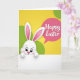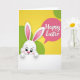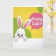 Designed with a sweet spring look, this card features a small white bunny with big, shiny eyes and long ears tipped with soft pink, peeking up from the bottom edge 🐰. Its cheeks are rosy, its tiny nose is pink, and its little paws rest on a white horizontal strip as if it’s leaning in to greet someone it cares about. Behind the bunny, a sunny yellow background fades gently into curved lime-green shapes that suggest rolling hills under warm daylight, with a calm, friendly mood that suits both romance and close friendship. In the upper right area, a rounded speech-bubble shape in deep magenta floats above the scene like a note being whispered. Inside that bubble, the greeting text sits centered in flowing white lettering, standing out clearly against the magenta. The bunny’s upward gaze and slight tilt feel like a tender, expectant pause, as if waiting for a shared smile 🌷. The lower white strip stays unlettered, while the magenta bubble and its white message draw the eye first. The final detail is the smooth yellow-to-green backdrop framing the bunny at the bottom and the magenta text bubble at the top right.