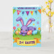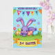 This design shows a rounded bunny-like animal with long lavender ears lounging in bright green grass, looking outward with big black eyes and a rosy blush that reads like a shy, friendly hello 🐰. Around it sit several egg shapes nestled in the lawn, each filled with small geometric patterns in orange, green, and calm blue, like little gifts waiting to be found. The scene feels companionable, as if the bunny is keeping watch for someone special to join the picnic. Across the top, a line of triangular bunting stretches through a light blue sky, with pink, yellow, and green flags carrying bold letters that form a cheerful greeting. Small stylized flowers float in the background in pink, orange, and purple, adding a springtime touch 🌷. Near the bottom, a golden ribbon banner curves across the grass with purple text centered on it to mark a milestone. The bunny’s relaxed pose and direct gaze sit beneath the colorful lettered flags and above the gold banner, with patterned eggs tucked to either side.