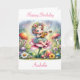 Personalized Birthday Card for a girl. Cute little whimsical anime fairy girl playing the violin atop of a pink flower surrounded by flowers and mushrooms.. Inside the card is a coloring page with a fairy tale theme.