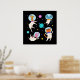 A poster with an image of astronaut animals in see-through helmets floating in space. Giraffe, mouse, cat & rabbit. So adorable and fun.