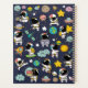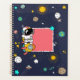 Astronaut, planets and rockets arranged on a navy cosmic theme.