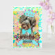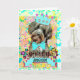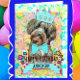Adorable Aussie Poodle puppy dog ready to celebrate a happy birthday. The cute shaggy pup wears a blue crown with pink stars and a matching bowtie. The Happy Birthday greeting is framed with sweet flowers and hearts. A banner sits below the Happy Birthday greeting and is a placeholder for a name. Inside the card are balloons and a flag banner. The inside greeting reads: Happy Birthday to the cutest kid in town. Have a joyous birthday filled with cheer and laughter. Any child, or fun-loving adult, would love this special card.