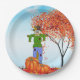 This autumn season paper plate was created by layering a variety of autumn season graphics. The scarecrow and pumpkins are overlayed onto a landscape with autumn leaves on an oak tree. A sunflower was added to scarecrow hat, and orange leaves followed by two large pumpkins. This paper plate comes in two sizes, choose the size that meets your needs. Anyone would like this paper plate, perfect for autumn gatherings, church bazaar or kids party.
