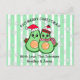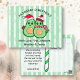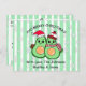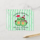 Cute Christmas avocados wearing adorable winter and Santa hats, with green and white striped background covered in snowflakes. Cute seasonal avocado humor.