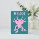 Say hello with this adorable postcard that features a simple style cartoon illustration of an axolotl salamander. The salamander and the "hello!" greeting are in a bright bubblegum pink and set against a dark teal colored background. The reverse side of the postcard has coordinating accents and is ready for you to write your own message.