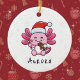Enjoy this cute Christmas design featuring an adorable pink axolotl with a big smile and wearing a Santa Claus hat. It's holding a red and white candy cane and eating a brown gingerbread man cookie. The background has subtle snowflakes. Personalize by adding a name. The kids will LOVE this ornament with the popularity of axolotls. Makes a great gift for the holidays. Goes well on other ornaments and products. Merry Christmas!