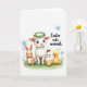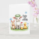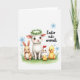 This card features a group of softly drawn baby animals gathered together, with a white, woolly little creature in the middle wearing a leafy green crown and looking calmly ahead. To one side, a light brown long-eared friend leans in close, its gentle gaze suggesting quiet affection 🐇. Nearby, two small yellow chicks nestle together beside a white hen with a tiny red comb, their blushed cheeks and glossy dark eyes giving the scene a sweet, friendly closeness. All of the animals sit along the lower edge on a lightly shaded strip of fresh green grass, as if they’ve met for a tender springtime moment. Across the upper area, simple holiday text appears in a soft pastel tone, spaced neatly so it doesn’t crowd the characters 🌷. The background stays bright white, letting the soft colors and rounded shapes stand out without distraction. A few small blue blossoms float near the top, scattered lightly like confetti against the open space.
