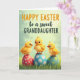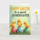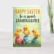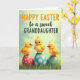 This design shows three golden-yellow baby birds perched atop patterned eggs, their big dark eyes and small orange beaks turned toward one another with a tender, close-knit look. Each chick has fluffy feathers with tiny spiky tufts on its head, adding a sweet just-hatched feel. They sit on a bed of green grass with softly blurred blades that suggests a calm outdoor spring setting 🌷. The eggs beneath them are colored red, blue, and teal, each decorated with neat white or yellow polka dots that stand out against the softer background. Near the top, the greeting text is centered above the scene, with one word in orange thicker lettering and the rest in dark green flowing lettering. The light is gentle and diffused, and the background fades into pale greens and yellows that keep the focus on the trio 🐰. Small highlights on their eyes and the rounded egg surfaces give the whole image a soft, glossy look. The grass at the bottom is a rich green band, with the eggs nestled firmly into it and their dotted patterns clearly visible.