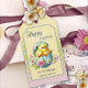 A sweet Easter gift tag featuring a painting of a cute chick in an egg with spring flowers. Great for an Easter celebration or also for a baby shower or to add to a gift for new parents.