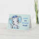 Here's a cute birthday card for a toddler, whether he be turning age one or age two. The front has an adorable little elephant with blue and white polka dot ears. He is wearing a blue and silver crown. The custom text at the right currently says "Happy 1st Birthday (Name)", but you may easily change it to anything you'd like. The image and text are placed on a subtle blue star pattern background. Inside is another image of an elephant in a hot air balloon, and a colorful layered birthday cake, along with more custom text.