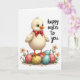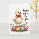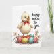This card features a soft digital illustration of a fluffy, pale yellow baby bird with round blue eyes and tiny lashes, giving it a sweet, friendly look. A small red bow sits neatly at its neck, like it dressed up for someone special. The bird stands atop a stack of large pastel eggs in gentle pink, light blue, and warm yellow, and their light floral patterns add a tender, gift-like feel 🌷. Below the eggs, a sandy patch holds little white flowers with orange centers, slim green shoots, and a few red buds that feel like they’re growing close together. The background stays bright white, keeping the scene airy and focused on the characters and spring details. On the right side, a flowing, handwritten-style message appears in a dark tone, positioned mid-height beside the illustration. Soft, diffused lighting smooths the textures and keeps the colors calm, while the eggs’ patterns and the tiny blossoms remain crisp enough to notice 🐇. The red bow is tied in a neat loop with short tails resting against the bird’s chest.