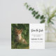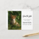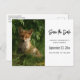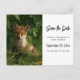 save the date postcard with a photograph featuring a cute little baby fox with red and white fur. Surrounded by lush green leaves and grasses.