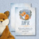 A little one is coming this winter. Cozy winter watercolor design featuring modern handwritten style script, orange cute sleeping baby fox on snowly background. The text can easily be personalized for a unique one of a kind design for your special day.