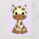 This postcard shows a baby giraffe cartoon with big black eyes on a geometric purple background on the front; but also on the back. This doubles the cuteness. The giraffe is so adorable it will please children, but certainly also their moms or dads.