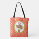 A tote bag with a cute baby monkey with a pacifier in his mouth Inside an olive green circle. The word Hello above his head, which can be customized with a name or other text. The background is an orange and white polka dot pattern.