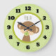 A clock with an illustration of a cute baby monkey with a pacifier in his mouth. Hello written above his head. Light olive green background.