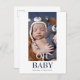 Modern photo baby birth announcement postcard, featuring a baby with crocheted teddy bear and hat; with the words: "oh baby"; in a unique vertical style card. Elegant contemporary style.