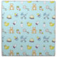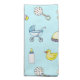 Cute pattern with baby items on the blue background: teddy, rubber ducky, pacifier, baby bottle, stroller... For a baby boy.