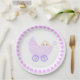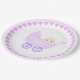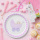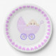 Cute baby stroller and hearts in violet color on white background paper plate. Baby text can be personalized. Ideal for baby parties, baby birthday or baby shower.
