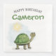 These custom party napkins feature a cute baby turtle illustration. A little green turtle is placed in the bottom left with a sun shining over it. It's good for a babu shower or kid's birthday party. A sample "Happy Birthday" message is printed across the top, followed by a sample name. You can personalize the napkins to include your own custom name or message of your choice.