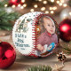 Cute Baby's 1st Christmas Tree Drawing 2 Photos Baseball. A cozy, Boho-inspired Christmas baseball featuring cute drawing of two children decorating the Christmas tree on a snowy hill and 2 custom photos. Soft earthy tones such as terracotta, cream, and green. Delicate snowflakes are scattered across the baseball, adding a touch of winter magic. The text 'First Christmas' is in elegant script. The overall aesthetic exudes a warm, rustic, and modern Bohemian feel, perfect for a stylish yet festive holiday look. Add your photos, baby's name and year.