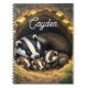 Cute personalized notebook with an ai illustration of a a mama badger and her babies all napping in their underground tunnel called a sett.