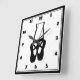 A clock with a black and white illustration of a ballet dancers lower legs and ballet slippers, standing on her toes, en pointe.