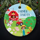 Give your little farmer her own special custom barnyard Christmas ornament! Holiday ornament has a cow, pig, sheep, cat, chicken, horse, and duck. Smiling in the corner is a bright yellow sun and in the foreground is an apple tree and young farmer kid. The pig has baby piglets and the sheep has a little lamb. Personalize the ornament with your young girl's first name on the front and the year on the back.