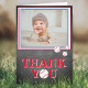 Modern and Cute Baseball Birthday Thank you Photo Card for Kids. The design has a custom child`s photo, and small and big baseballs. The background is a trendy gray chalkboard. Personalize the card with your photo and name. You can also change the text inside the card and write your own or just erase it.
