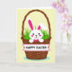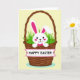 Designed with a sweet spring scene, this card shows a white bunny 🐰 peeking out of a woven brown basket as if it’s shyly greeting someone special. Its tall ears stand upright with bright pink inner details, and its round eyes and rosy cheek dots give it a tender, friendly look. A small pink bow tie at the neck adds a dressed-up touch, like it’s ready for a cozy visit. The basket is drawn with interlocking weave lines and is filled to the top with deep green blades of grass, creating a fresh outdoor feel. Below the basket sits a white banner outlined in pink, with the message printed in black lettering centered across it. The background is a pale yellow with a light check pattern that reads like soft picnic cloth, and a faint blue shadow under the basket adds depth. A few tiny 🌷 accents echo the pink details in the ears and bow tie. The basket’s base hovers over a soft blue oval shadow against the yellow checked backdrop.