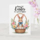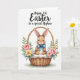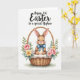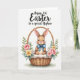 This design shows a long-eared bunny 🐰 nestled in a rustic woven basket, painted in warm browns with rosy cheeks, fine whiskers, and big dark eyes that meet yours with a tender, trusting look. A powder-blue bow sits neatly at its neck, adding a gentle accent that feels like a sweet gift from a close friend. The basket’s textured weave is clearly defined, and inside it rests a fluffy cream lining that makes the little bunny look extra cozy. Around the basket, spring flowers and greenery form a soft frame: pink roses, small yellow blooms, tiny white florets, fresh green leaves, and a few muted blue berries 🌷. Near the top of the card, a flowing line of occasion text is centered in a dark tone, with a smaller dedication line placed just beneath it in a lighter shade. The background stays bright white, letting the warm browns and garden colors stand out without crowding the scene. At the bottom, faint earthy green shading suggests ground beneath the basket and flowers.