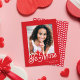This modern and sweet Valentines Day photo classroom card features a colorful red background, pink heart accent, one vertical photo, and white script "Be Mine". The back of the card has a coordinating red and pink heart pattern, which can be removed if desired. You can also add another photo to the back and/or additional text to the back. This smaller size is perfect for Valentine's Day classroom card exchanges!