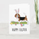 Send Easter greetings with this adorable card featuring a Beagle wearing bunny ears, a baby chick, and a trio of Easter eggs.