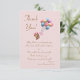 Cute Bear and Balloons Theme Flat Thank You Card design is the perfect way to thank your guests after your baby shower. Design features the adorable image of a cuddly teddy bear wearing a pink bow and holding on to a bunch of balloons. The words, "Thank You!" are displayed in decorative lettering in upper left corner. Below image, your customizable text is displayed in gold lettering. Designed to coordinate with the Cute Bear and Balloons Themed invitations and accessories.