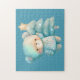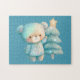 A puzzle with an adorable illustration. A cozy bear with stars and sparkles in its fur. Standing beside a Christmas tree. Pastel blue-green color. Whimsical and cute.
