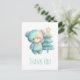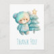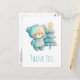 Thank you postcard with an adorable illustration. A cozy bear with stars and sparkles in its fur. Standing beside a Christmas tree. Pastel blue-green color. Whimsical and cute.