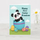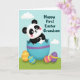 This card features a stylized black-and-white bear cub with rosy cheeks and wide eyes, peeking out of a large cracked blue egg with a jagged rim that sits like a little crown above its head. The bear’s soft, friendly gaze and slightly tilted pose give it the look of leaning in for a warm hello, like a close friend or sweet companion. A purple band wraps around the egg, which rests on bright spring-green grass dotted with small, decorative oval eggs in orange, blue, pink, and purple with yellow stripe patterns. In the background, a light blue sky holds a few rounded, pale clouds, keeping the scene airy and gentle 🌷. The lighting is soft and smooth, with subtle shading that adds depth without making the artwork feel heavy. A short Easter message appears in the upper right area in green lettering, standing out clearly against the sky 🐰. The lower edge is filled with grass and scattered mini eggs, while the cracked shell frames the bear at center stage.