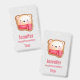 A name tag with a cute and adorable bear face set on a cookie base. Wearing a red and white striped scarf.