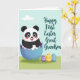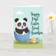 Designed with a black-and-white bear cub at the center, the illustration shows it peeking out of a cracked blue eggshell with rosy cheeks and a wide, open smile 🐰. The shell’s jagged rim is traced with a thin purple line, and it sits on a light green patch of ground where short grass strokes add texture. To the right of the bear, a flowing dark teal message is set in a cursive-style font, taking up the open space like a gentle note to a close friend. The bear’s bright expression and the way it leans forward from the shell give the scene a sweet, affectionate energy, like it’s greeting someone it’s happy to see 🌷. Behind everything, a pale blue sky fades softly upward with one small, puffy white cloud drifting near the top. In the lower right corner, three decorated eggs add color: a violet egg with white stripes, a yellow egg with white dots, and a deeper blue egg with light blue specks. The bear cub has large round ears, pink blush on its cheeks, and stands slightly left of center while the teal lettering sits to the right.